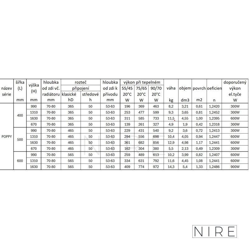 - 500 × 990 mm, výkon 431 W, (topná tyč 400 W)
