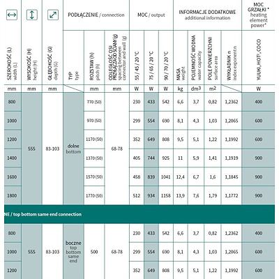 • 800 × 555 mm, výkon 433 W, topná tyč 400 W - připojení klasické (na rozteč) / středové 50 mm