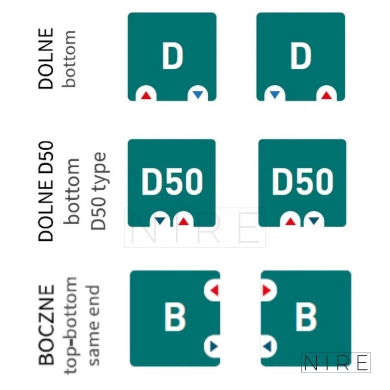 - Spodní: 770 mm, 970 mm, 1170 mm, 1370 mm, 1570 mm, 1770 mm (na spodních stranách radiátoru)