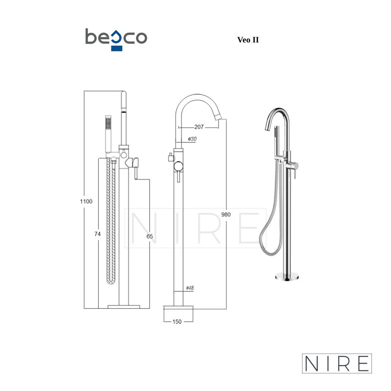 Vanová stojánková baterie je dodávána včetně příslušenství (sprchová růžice a hadice).